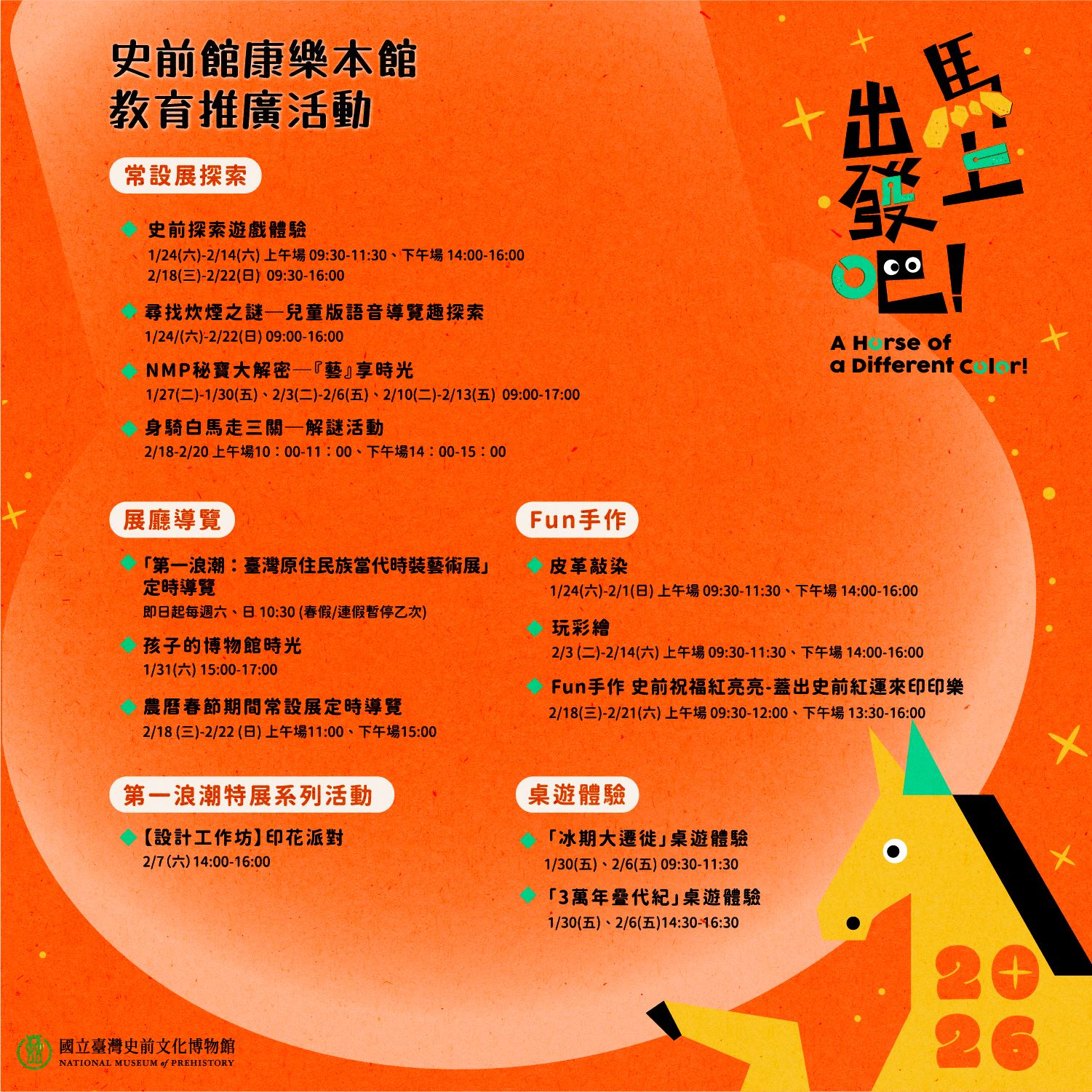 國立臺灣史前文化博物館春節初二至初六(2/18~2/22)開館迎賓,康樂本館「馬上出發吧」及卑南遺址公園「你馬來公園 Lí mā lâi kong-hn̂g」系列活動,持續以展廳探索遊戲及彩繪DIY豐富大家的寒假及春節。