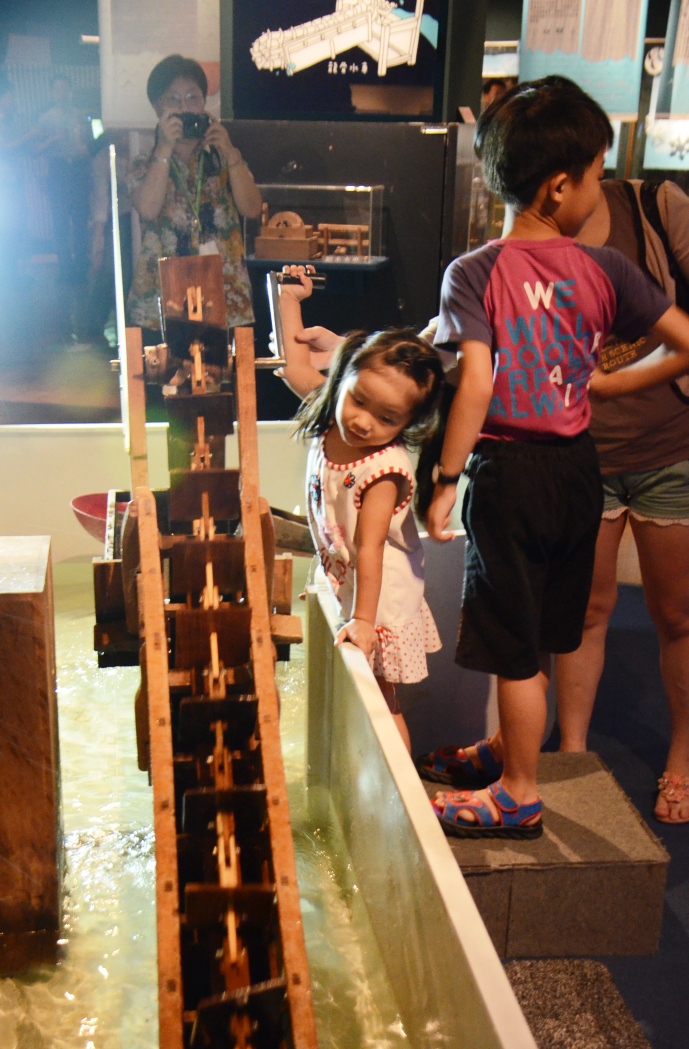 文明和水息息相關,水的文明展區讓民眾瞭解古文明為適應氣候條件發展出不同的取水及儲水方式,許多遺跡存留下來,如今成為著名的地景,如印度的階梯水井、土耳其的地下水宮等。東西方的人們為了取水、利用水力,也各自發明了不同的水車,用以灌溉取水,也用於鋸水等工作,後來也發展出水力發電。亞洲的小劇場即介紹第一個點亮臺北三市街街燈的龜山水力發電廠的故事。