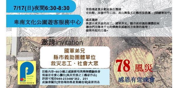 「78風災,感恩有您」晚會活動,將安排90分鐘以上感恩節目,以穿插感謝的歌曲與舞蹈體驗方式進行,現場亦有受災工藝家組成的愛心攤位。若民界想知道進一步相關消息與攤位募集,請電洽089-233466*252 、251或臉書關注[普悠瑪部落產業鑄造場]最新消息。
