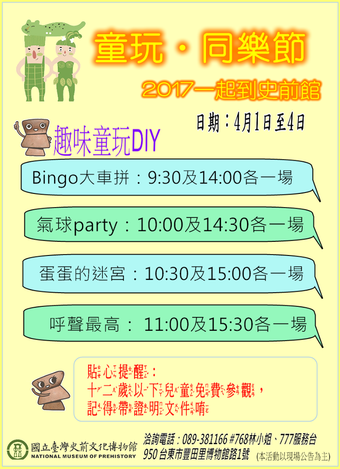 4月份史前館配合兒童節主題規劃『同玩童樂節-2017一起到史前館』活動,4月1~4日(六、日、一、二)每天9點30分到16點,在2F迴廊集結創意手做DIY、特色市集擺攤、免費玩具製作以及展廳主題導覽等活動,提供參觀民眾多樣化知性娛樂的選擇,快樂逛遊博物館。